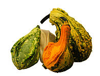 Nicht zum Verzehr geeignet! Interessante Formmischung aus ungewöhnlich gewarzten und gezackten Formen, meist zweifarbig. Zur Dekoration – gehört zu den Zierkürbissen.