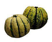 Dekorativer Speisekürbis mit dunklen Längsrillen, harter Schale und orangem Fruchtfleisch. Kastanienähnlich im Geschmack. Ideal zum Füllen und Auslöffeln.